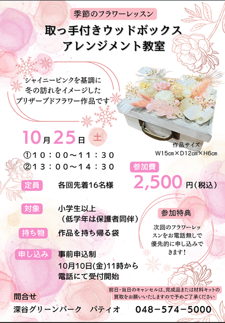 グリーン・ツーリズム埼玉(グリツリ埼玉) > グリーンツーリズムをもっと楽しむ > イベント情報 > 季節のフラワーレッスン 取っ手付きウッドボックスアレンジメント教室(10月)