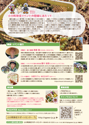 ランチタイム&トークの時間は、ゲストに小川町での農ある暮らしを実践する高橋さん(専業農家)と家族で農ある暮らしを楽しみつつ、自伐型林業にもチャレンジしている藤川さんをゲストにお迎えし、小川町での農ある暮らしのリアルを語っていただきます。