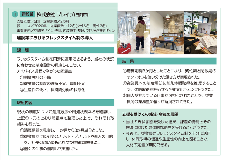 | 株式会社プレイブ | 建設業 | 建設業におけるフレックスタイム制の導入 |