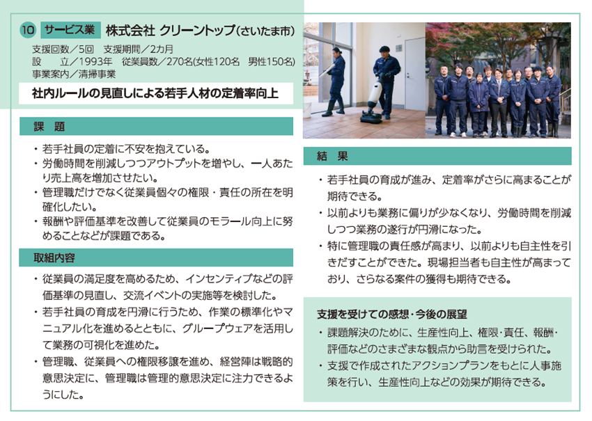 | 株式会社クリーントップ | サービス業 | 社内ルールの見直しによる若手人材の定着率向上 |