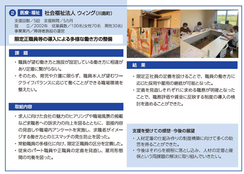 | 社会福祉法人ウィング | 医療・福祉 | 限定正職員等の導入による多様な働き方の整備 |