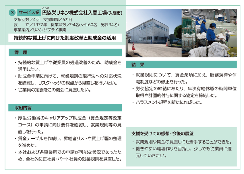 | 巴協栄リネン株式会社 入間工場 | サービス業 | 持続的な賃上げに向けた制度改革と助成金の活用 |
