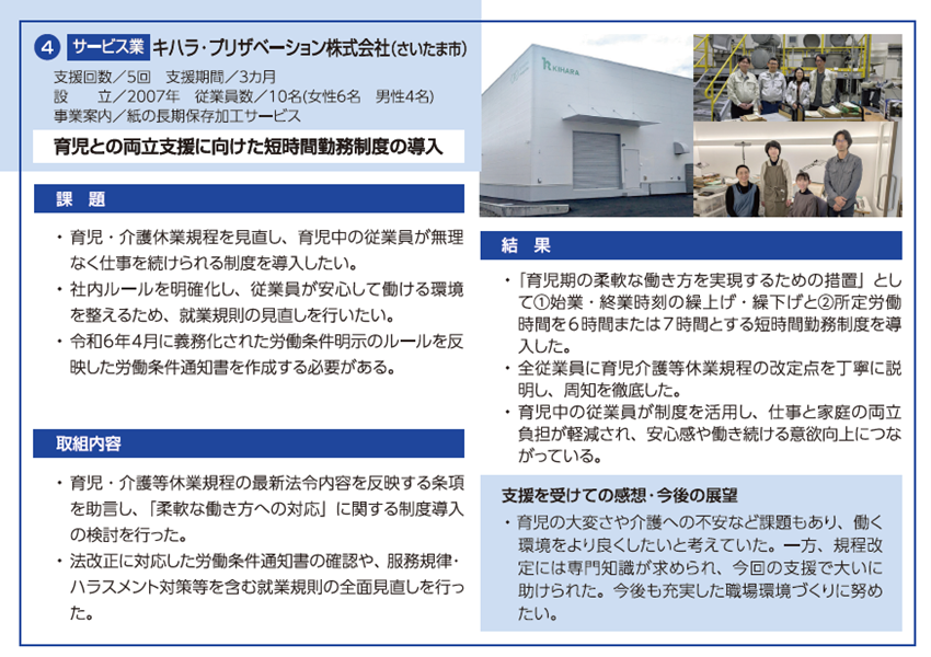 | キハラ・プリザベーション株式会社 | サービス業 | 育児との両立支援に向けた短時間勤務制度の導入 |