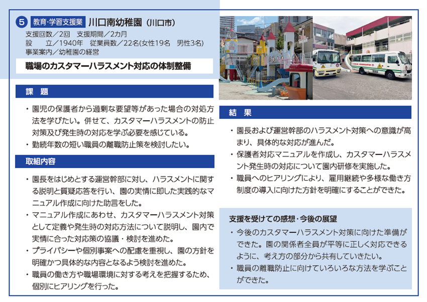 | 川口南幼稚園 | 教育・学習支援業 | 職場のカスタマーハラスメント対応の体制整備 |