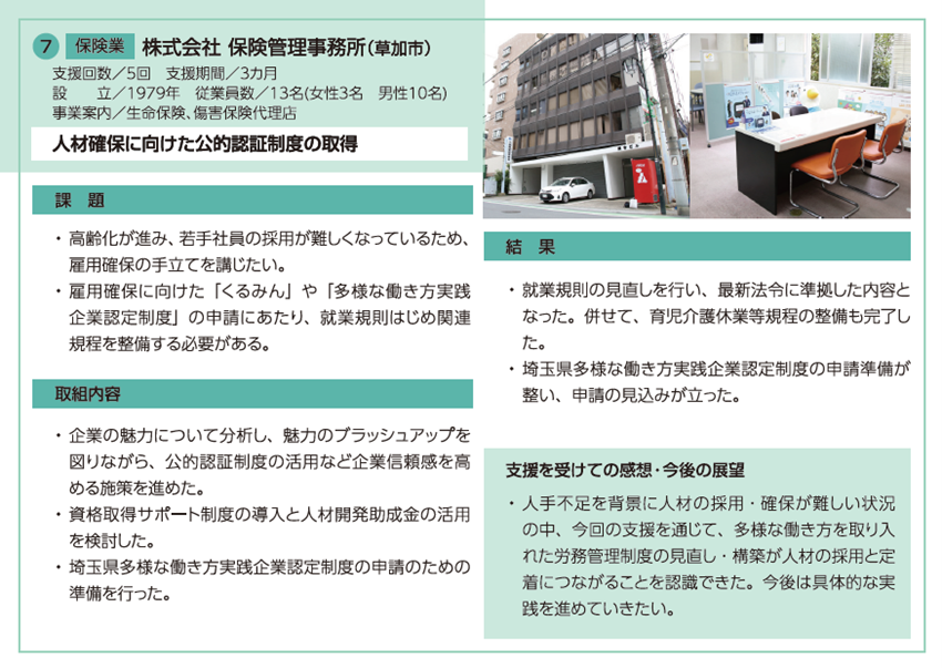 | 株式会社保険管理事務所 | 保険業 | 人材確保に向けた公的認証制度の取得 |