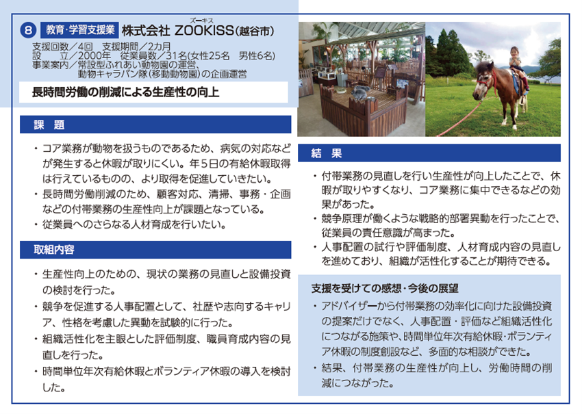 | 株式会社ZOOKISS | 教育・学習支援業 | 長時間労働の削減による生産性の向上 |